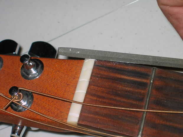 Jugar con la cuerda y mira abajo. La muesca de la tuerca debe ser tan profunda como si fuera otro traste allí sosteniendo la cadena. En otras palabras el differece de altura de la cadena entre la tuerca y el primer traste debe ser igual a la diferencia entre los dos primeros trastes.