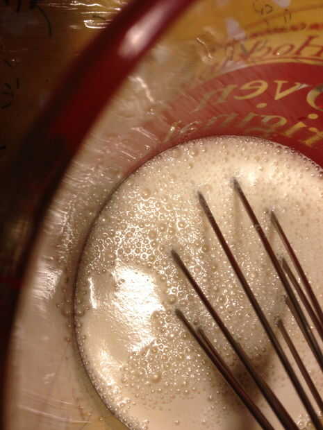 4. usando la batidora con gancho amasador o por mano agregue la mezcla de prueba de la levadura a la harina. Cubierta y en lugar cálido. Cuanto más caliente más rápido hacerlo la noche anterior y dejarla en la cocina durante la noche (las voraces hordas levantarse temprano y no esperan para el desayuno esperan con impaciencia para que poder freírlos)