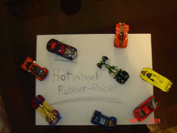 con una simple goma, cintas, ganchos y un coche de hotwheel, usted puede poner el movimiento en el hotwheels que yacen alrededor de la casa.