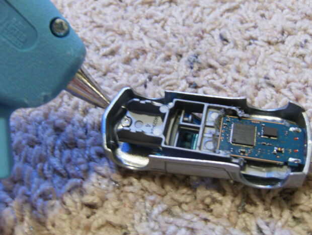 pensé que sería divertido tener un pendrive que era marca Honda o Ford o Chrysler, etc.. Sólo sucede que tenía una llave del coche no deseado.Hackeado de la lámina dominante, ahuecada la cabeza plástica de clave y me ajustaron un pendrive dentro.Paso