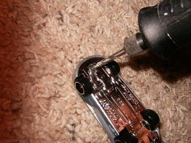 Desarmar el coche es fácil. Utilice el Dremel con la broca. Taladre con cuidado el remache o remaches en la parte inferior. Algunos coches tienen dos de ellos. Una vez que los remaches se perforan hacia fuera, el coche se deshagan en pedazos.