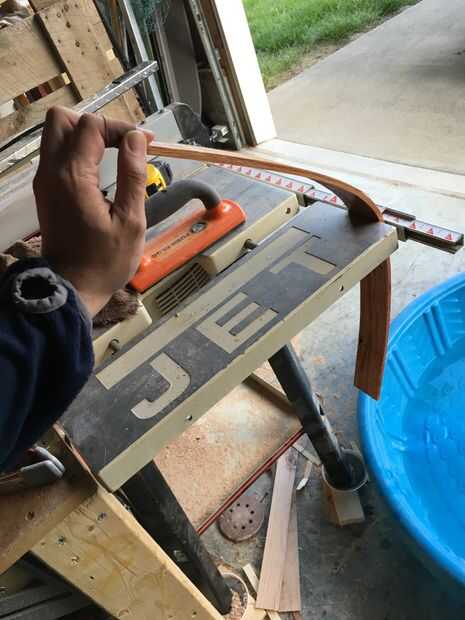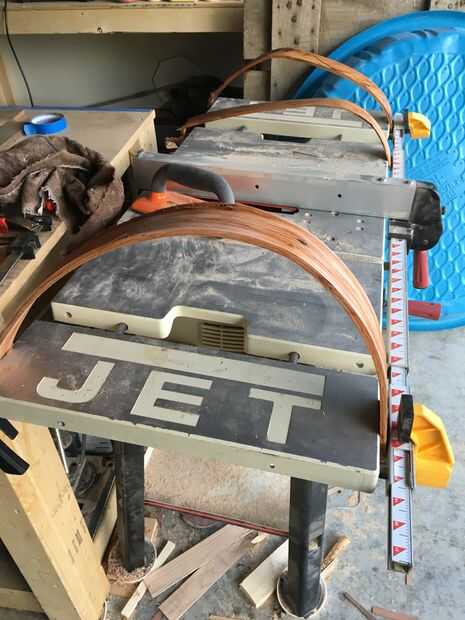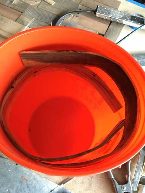 después de empapar la madera durante 5 a 6 horas, era hora de ver si se doblaría. Usé mi mesa vio y comenzó a dar forma y plegado a los trozos de madera y luego de sujeción en su lugar. Pongo dos de las juntas en un balde de 5 galones para darle el bucle de 360 que mi hijo querido en la pista. La próxima vez que hago este proyecto o uno como él, voy a construir una forma para poner la madera en doblarla, pero estaba tratando de ser creativo y utilizar lo que tenía en mi garaje.