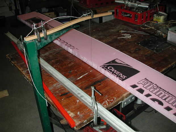 El hilo va de la abrazadera en c en el brazo voladizo, hacia abajo a través de un agujero en la tabla a un tornillo en la parte inferior.