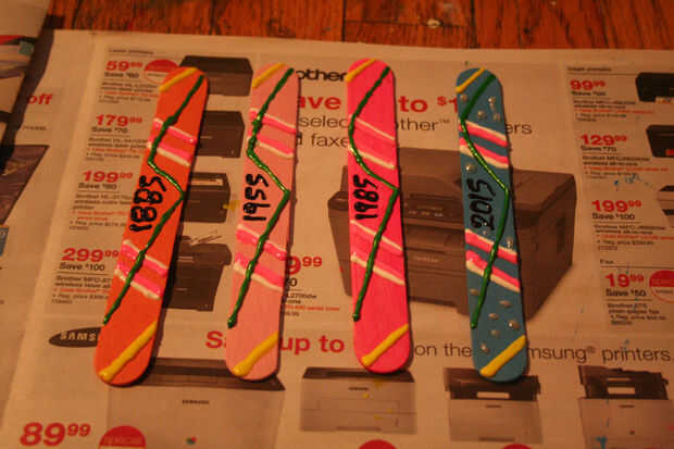 Ahora, usar sus pinturas puff al tubo hacia fuera el diseño clásico se ciernen. Puede referirse a la película "Volver a los futuro II" para la referencia, o búscala en Google y utilizar como guía. A continuación, escribir los años con pintura puff negro.