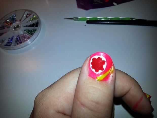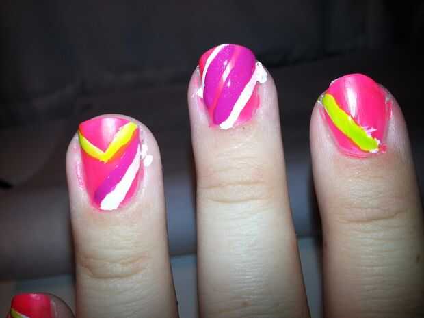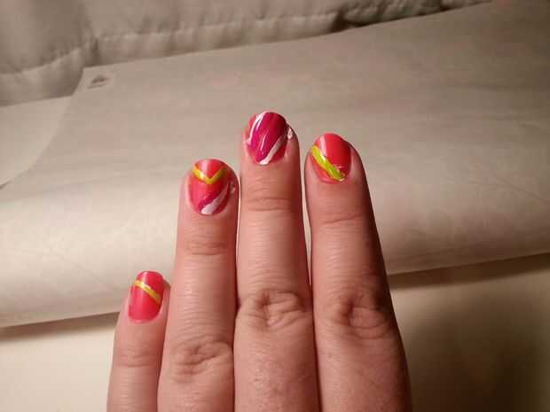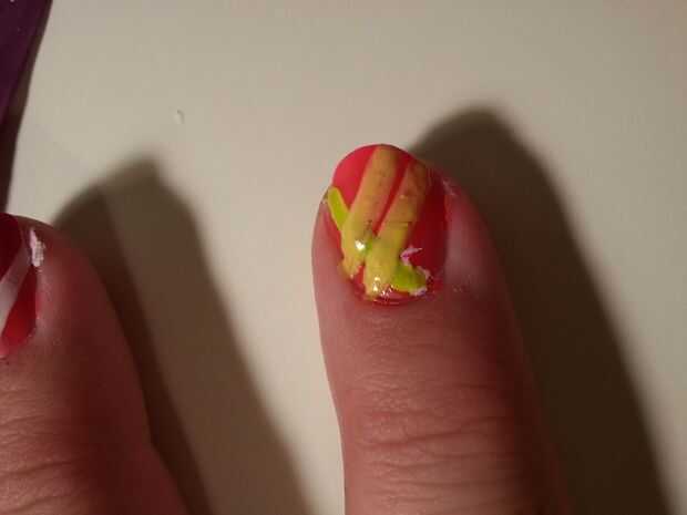 Añadir pequeños segmentos de amarillo en las uñas un par. En un clavo, agregar dos rayas paralelas de amarillo.
