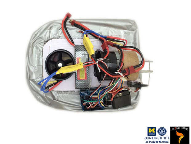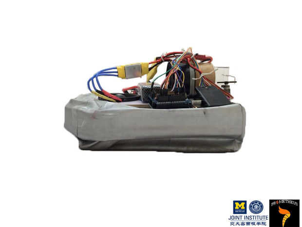 Por último, fijar las cuatro capas, el tablero superior de madera, el tablero superior de la espuma EPE, el inferior tablero de la espuma EPE y la falda con el tablero de madera inferior junto con las cuerdas del cáñamo como se ve en la figura 37. A continuación, puede conectar otros componentes electrónicos con alambres en el aerodeslizador como se ve en la Figura 38.