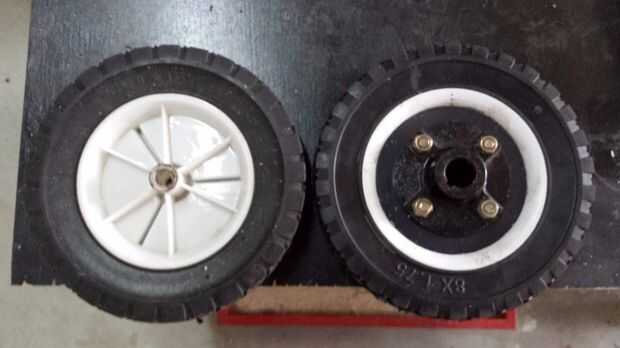 - No quería que mi HoverDisk sea demasiado alta de la tierra por lo que he quitado las ruedas de la silla de ruedas grande y compró algunos nuevos de 8 pulgadas las ruedas de la cortadora de césped.