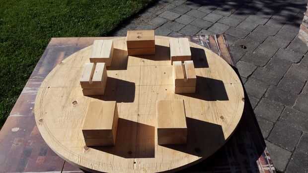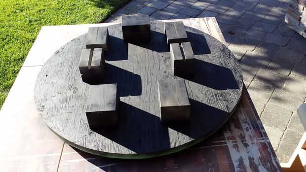 Esta es la parte inferior de la plataforma. Había construido con madera contrachapada de 3/4 de pulgada. El diámetro es de 30 pulgadas. He hecho este tamaño por lo que todavía puede caber por las puertas en la escuela en que imparto clases. Los bloques que ves son sostener varias partes como los motores y ruedas. Yo entonces aerosol pintado negro para que se vea más bonito.