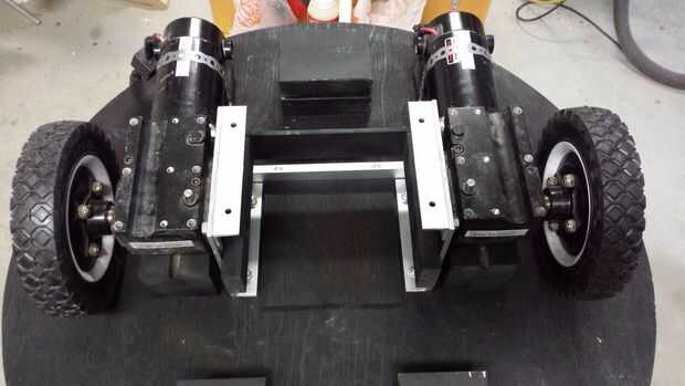 Aquí hay algunas fotos de las ruedas y ruedas adjuntadas. Las ruedas son de una vieja silla de ruedas. Las ruedas son de 4 pulgadas de diámetro y hecha de nylon por lo que no hacen mucho ruido sobre una superficie plana lisa. Puse las ruedas en bloques de madera por lo que acabarían en exactamente la misma altura que las ruedas más grandes. La última foto muestra la baterías y electrónica (más detalle sobre esto a seguir). Construí la vivienda para los motores de la unidad del asiento de aluminio de la silla de ruedas desechada pero podría usar cualquier otra sustancia que pudiera sostener todo junto.