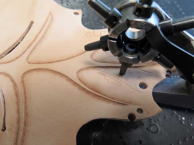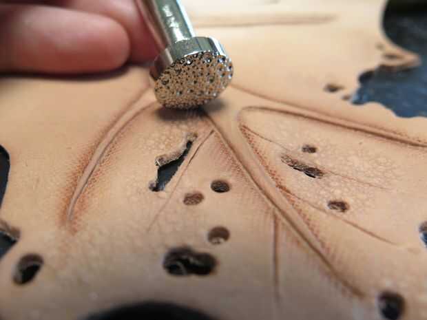 Alteré la pieza bolsillo para agregar algunos agujeros otros detalles unas andrajosos, luego que este trazado en la hoja ya había labrado para el bolsillo y utiliza mi cuchillo hole punch y exacto para cortar las zonas que había trazado. Última solía un sello de estera de Tandy para dar algunas zonas de la hoja de una textura áspera.