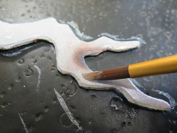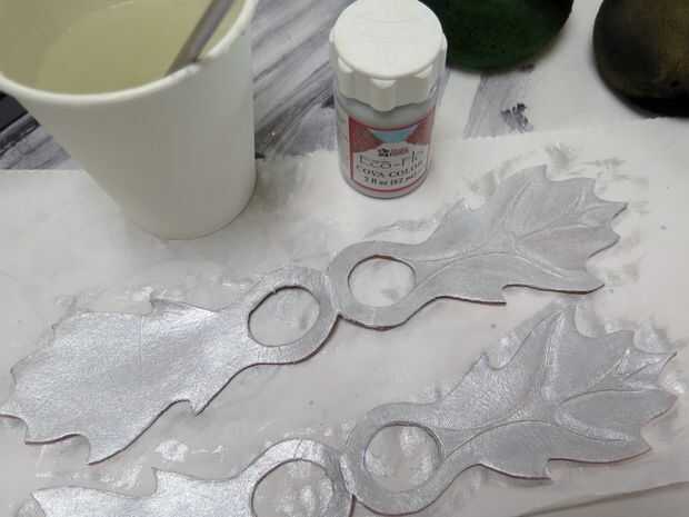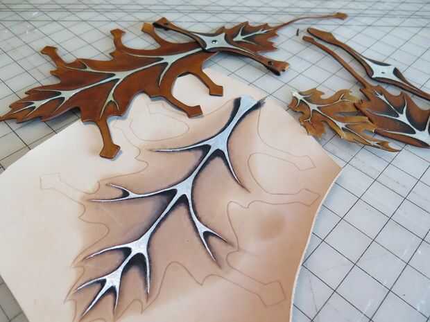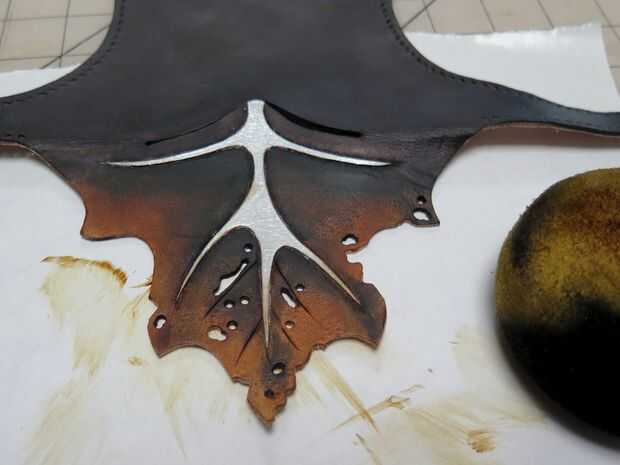 Pinté las ramas sobre el casco y las hojas de las hebillas de cinturón con Color Plata de Cova. He encontrado esta pintura también fue mejor y le dio el acabado más liso cuando se aplica sobre el cuero mojado.