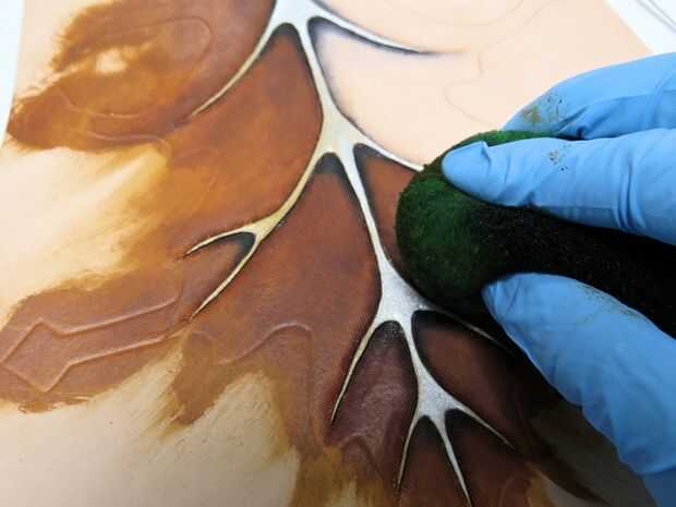 Primero moje cada hoja completamente, y luego utilicé un pincel para sombra alrededor de las venas de la hoja levantada con Waterstain negro. Apliqué la mancha como una acuarela, dejándola sangrar y se descoloran hacia fuera en el cuero mojado. En las hojas descomposición usé más Waterstain negro, aplicando algunas alrededor de los agujeros y áreas con textura.