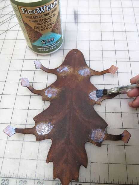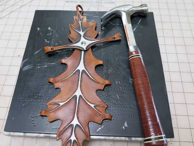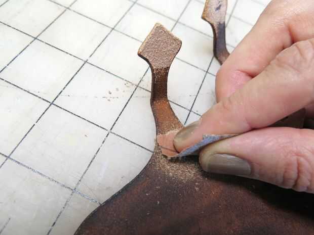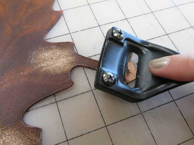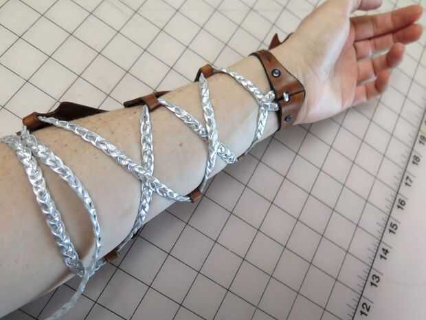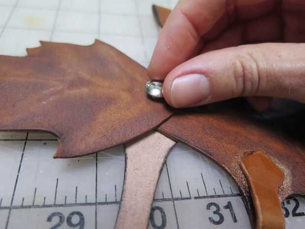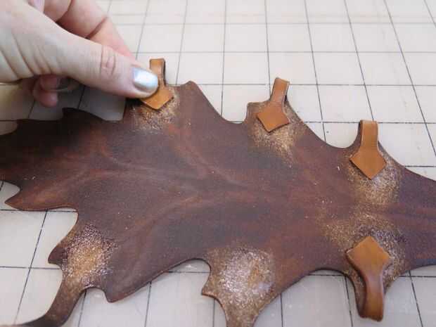 Para crear los lazos que se utilizarían para ate para arriba los brazales, pegué hacia abajo las lengüetas a cada lado de las hojas, después de raspar y lijarles. He creado los lazos en los extremos de la pieza central de la muñeca usando una perforadora y remaches.