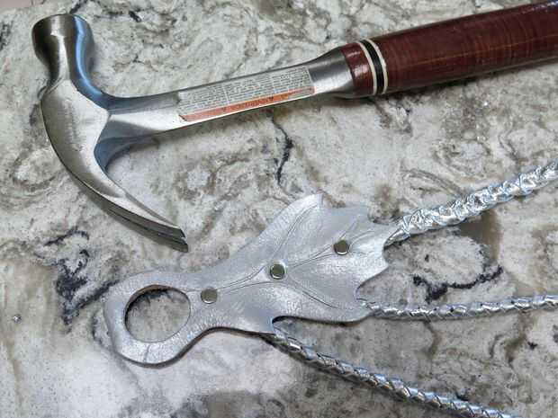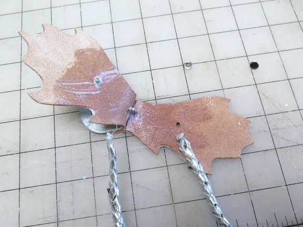 Perfora tres agujeros en cada hoja y luego intercala los extremos de las trenzas entre las dos capas de las hojas, fijándolos con remaches y pegamento.