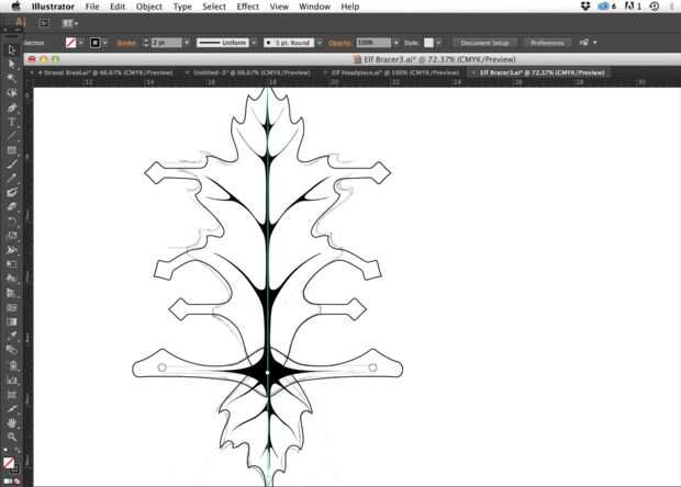 Cuando tuve bien montaje mock ups del casco, brazales y de bolsillo, analizan todas las piezas e importados en Illustrator. Allí trazado con la herramienta pluma, haciendo las modificaciones que quería duplicar y los bancos donde había múltiples o parejas. Este paso no era estrictamente necesario, pero me resulta muy útil para tener copias digitales limpias de mis patrones. Hace ajustar o duplicarlos mucho más fácil. Y, por supuesto, me permite compartir con ustedes!