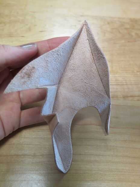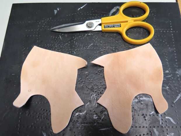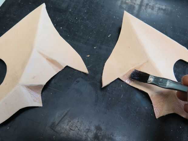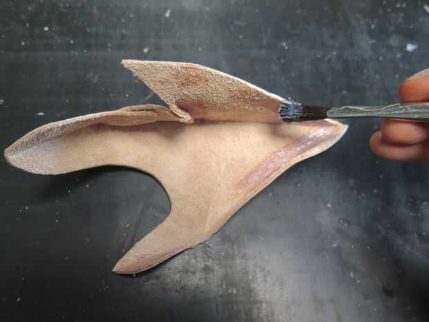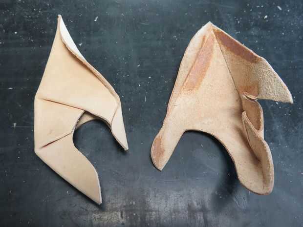 A continuación dobla cada oído en su forma básica que luego utiliza cemento de contacto del cuero en algunos lugares para mantener la forma, asegurándose de dejar la mayoría del espacio entre las dos capas abiertas por lo que mi oído sería capaz de encajar dentro de.