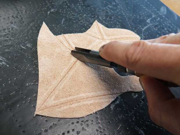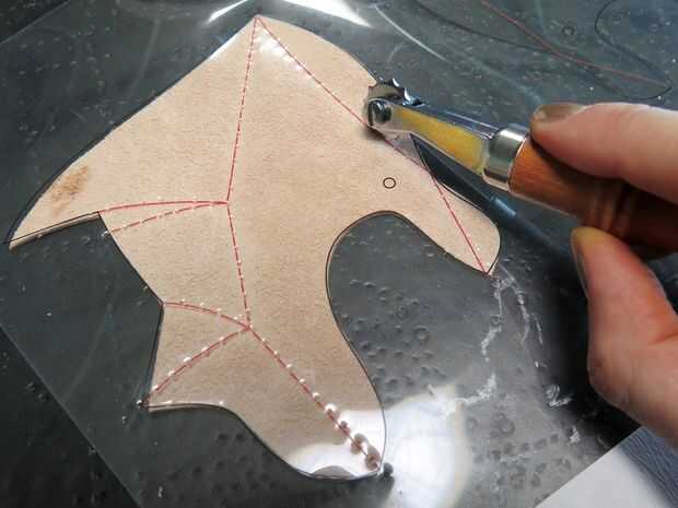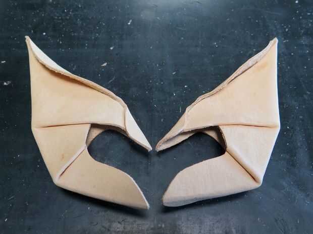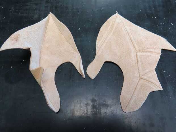 Para construir mis orejas de elfo, primero corte los patrones de oído había remontado, luego volcó mis piezas de cuero y ponen mis patrones sobre la parte inferior de mi corte de oreja salidas. Usa la ruedecilla para marcar las líneas de pliegue a través en el cuero y luego arrancado todas estas líneas con mi V-gubia para hacerlos más fáciles de doblar.