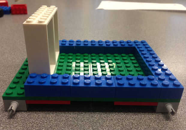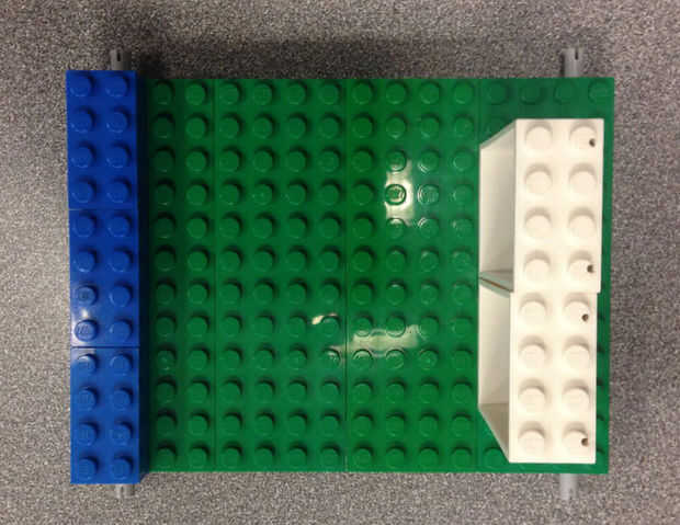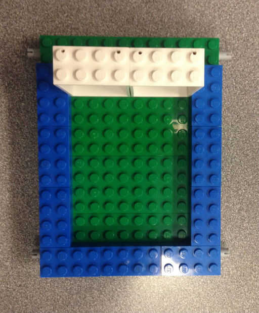 Alinear 3 bloques azules a lo largo de la parte posterior del borde (frente a lado de las puertas). Tomar 6 bloques azules y alinee los bordes horizontales. Nota: No hay bloques deben pasar las puertas!