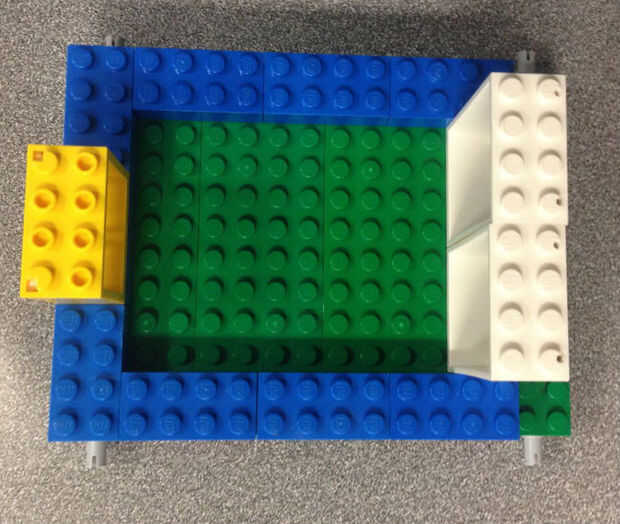 Coloque la ventana amarilla en la parte superior del bloque azul en el centro trasero de la casa.