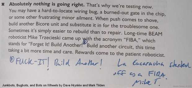Tomé una foto de una página especial del maravilloso libro Junkbots, Bugbots y los robots sobre ruedas por Dave Hrynkiw y Mark Tilden!