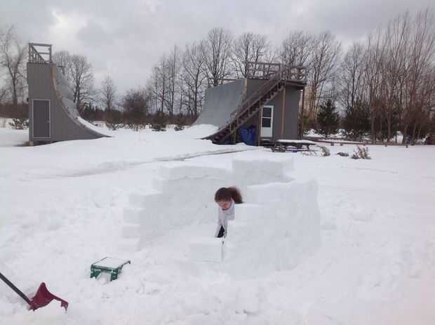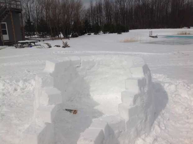 Me apilados encima de las paredes laterales de la entrada y había atado a las paredes laterales del iglú con un patrón de entrelazado de los bloques. He dejado el techo de la entrada hasta el final de la construcción, así podía desplazarse dentro y fuera del iglú con bloques como trabajaba en el techo del iglú.