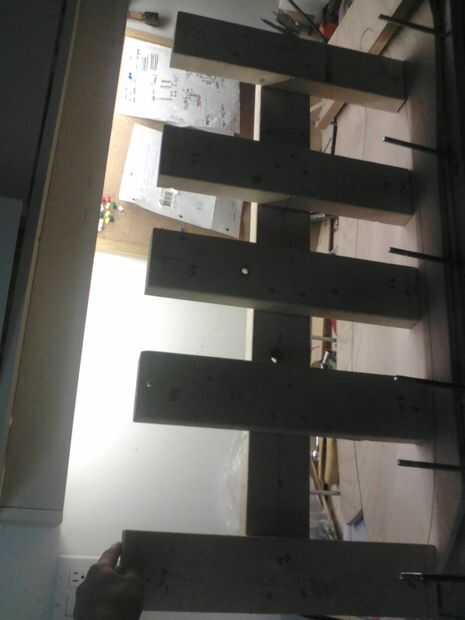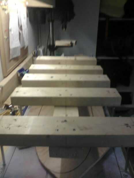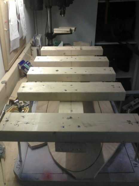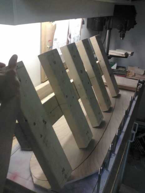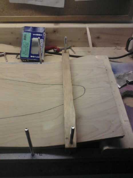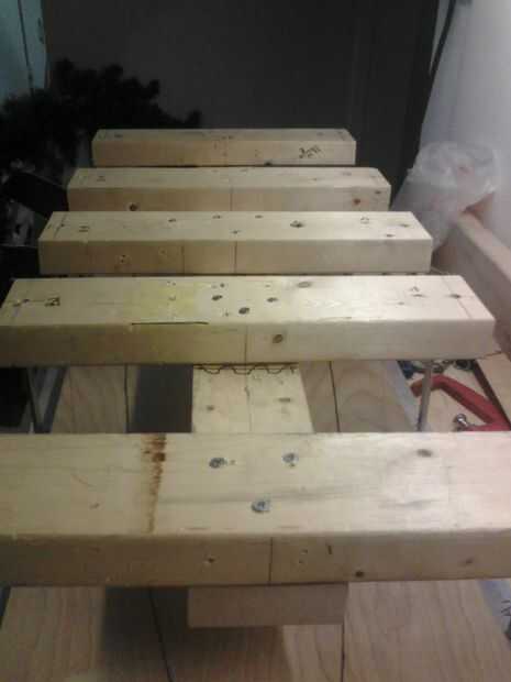 La parte superior de la prensa es el más importante ya que es lo que ejerce toda la fuerza en el tablero para darle forma. Cortar cinco 2 x 4 que se pone perpendicular en la parte superior un sexto más largo 2 x 4 que comienza desde la parte delantera de la prensa y termina cinco o seis pulgadas de 2 x 4 que va ser curva la cola de subir. (Si no pones la 2 x 4 en el final, para la curva de la cola, luego el 2 x 4 para la parte superior pueden abarcar toda la longitud de la tabla larga). Dependiendo de la longitud de su prensa, puede requerir más de cinco perpendicular 2 x 4.