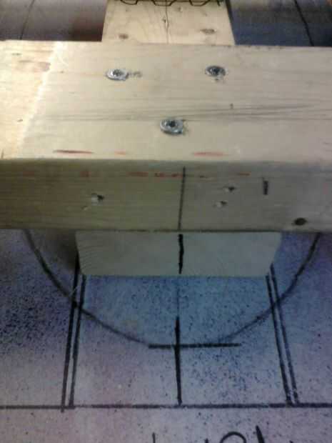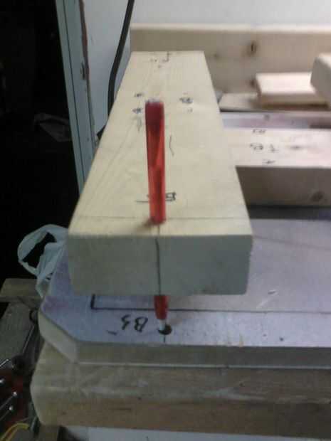 Cuando taladre los orificios para los pernos debe asegurarse que "la Cumbre" es perfectamente centrada y colocada correctamente. Tome un lápiz o creyón pequeño y palillo a través del agujero de 2 x 4 más pequeño que hizo anteriormente. Asegúrese de que taladre el agujero lo más recto posible. Puede hacerlo utilizando una prensa del taladro, pero si no tienes uno tendrás alguien ayudarle en la perforación.