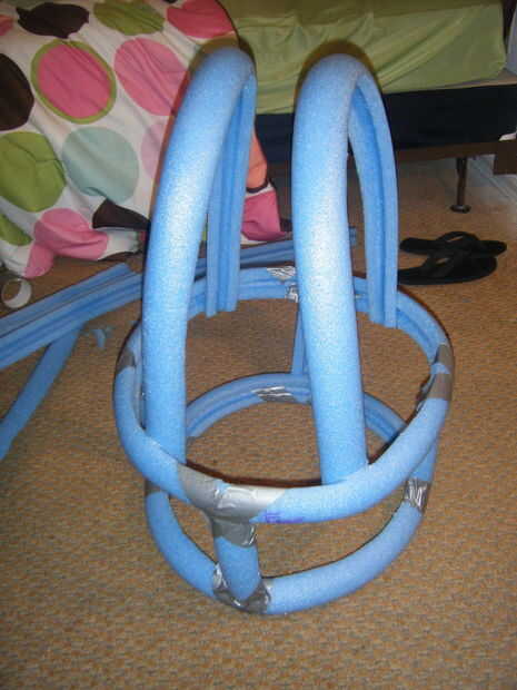 Para empezar el cuerpo cortar toda mi diversión tallarines a la mitad para que sean fáciles de manipular y formar en formas en lugar de ser tan resistente al cambio. Una vez que se hizo tiene mi pato cinta y me fui a la ciudad. Empecé con círculos y óvalos de medio para obtener la forma general del cuerpo de Kevins sin hacerlo demasiado detalladas todavía. También me aseguré de hacer un área de fideos que se ajustan como tirantes para que exista en algún lugar de mi cuerpo a la estructura de soporte. Después de grabar cada sección, tomé un marcador sharpie rosa oscuro y dibujó las líneas donde los fideos conectan de modo que yo podía caliente pegamento todo en su lugar.