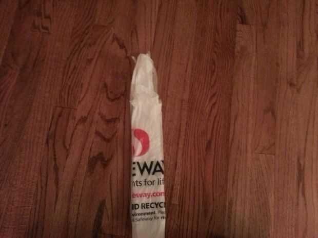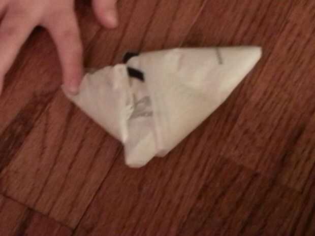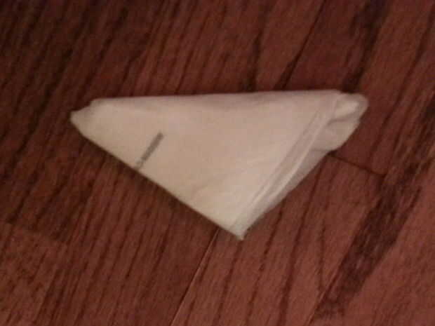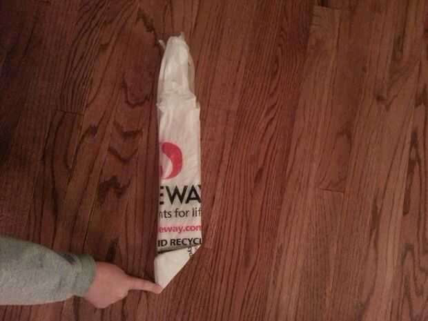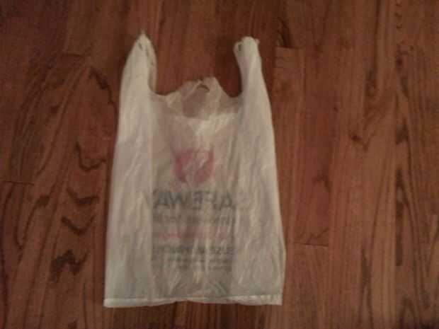 1. Aplanar la bolsa 2. doblar por la mitad 3. doblar por la mitad otra vez 4. desde la parte inferior doblar la bolsa en triángulos 5. continuar hasta que los mangos queden 6. doblar los mangos por la mitad 7. pliegue el mango en un triángulo 8. tuck en base