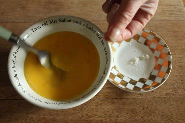En el caso de 4 yemas o huevos enteros, añadir una pizca de sal marina cruda o de un cuarto a media cucharadita de azúcar de caña crudo, según el uso eventual de los huevos. Si pasan frío en cantidades más grandes, ampliar en consecuencia.