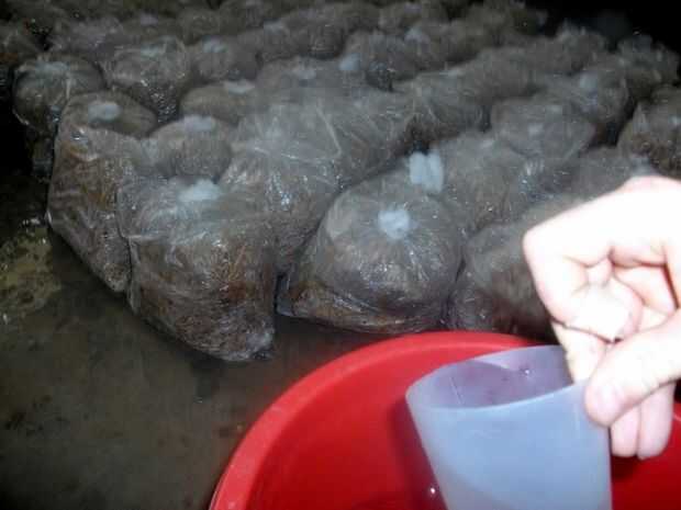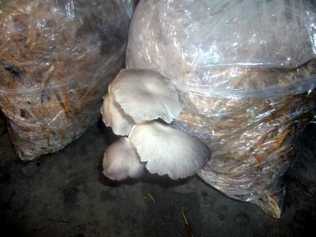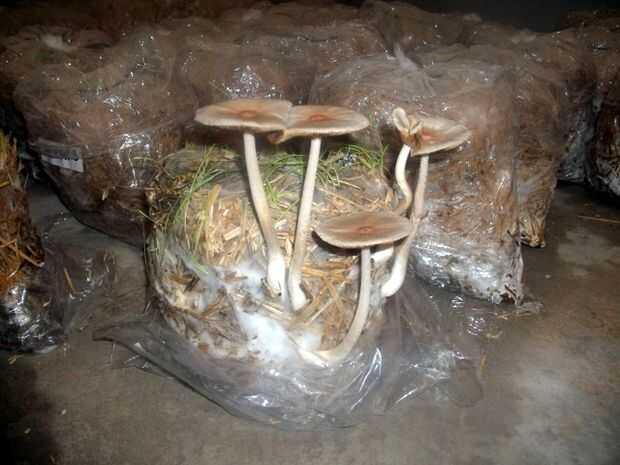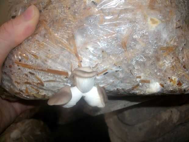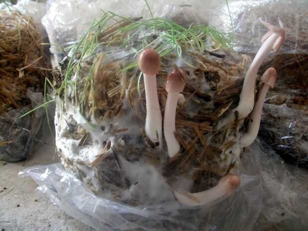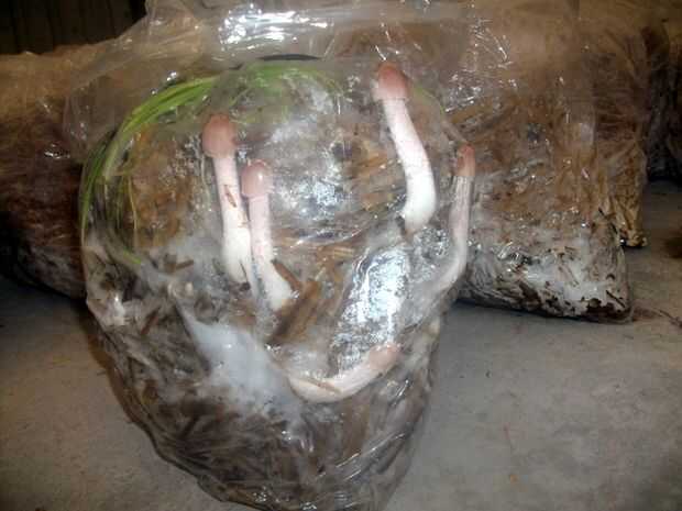 Por último, como las bolsas se convierten en completamente colonizadas, las etapas iniciales de fructificación (o fijación) puede ser visto.