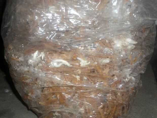 Regularmente Revise bolsas para cualquier contaminación del molde y quitar cualquier bolsas infectadas de la zona de crecimiento. Moho negro que se encuentra dentro de la paja puede indicar esterilización inefectiva. También puede notar brote paja y la aparición de hongos no deseados como la tapa de la tinta (ver fotos). Moldes verdes son comunes y pueden ser causadas por semilla contaminada (esterilización del grano ineficaz), humedad alta / baja niveles de spawn y esterilización paja ineficaz. En esta primera etapa, es mejor simplemente eliminar bolsas infectadas, mientras que usted quiere evitar su propagación. Hasta un 10% la pérdida debido a la contaminación se mira generalmente como aceptable.