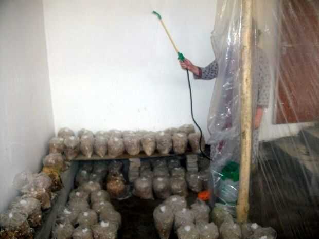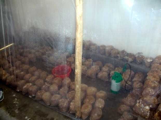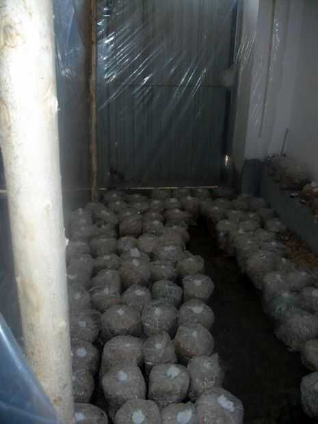 Una vez que la fijación ha comenzado, es hora de sacar el sustrato de las bolsas. Naturalmente la fijación ocurre como humedad aumenta, aparecen niveles bajos de luz y caída de niveles de temperatura. Aumentar la humedad creciente del ambiente rociando regularmente con un rociador de agua (Evite rociar directamente sobre los hongos). También puede mojar el piso y dejar contenedores de agua abiertos en la habitación (95-100% de humedad se recomienda). Como nuestro clima es muy seco, sólo logramos el 60%, cayendo hasta el 40%, con un pulverizador de 5 litros de agua 2 - 3 veces al día (incluso a estos niveles de humedad que se logra un buen resultado). Para evitar excesivos niveles de CO2 , permita que la zona de cultivo purgar con aire limpio antes de rociar. Si se puede regular la temperatura en consecuencia.