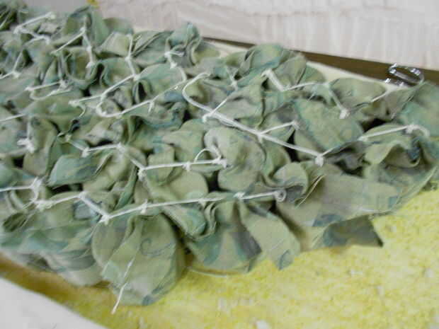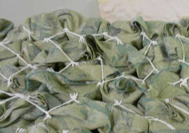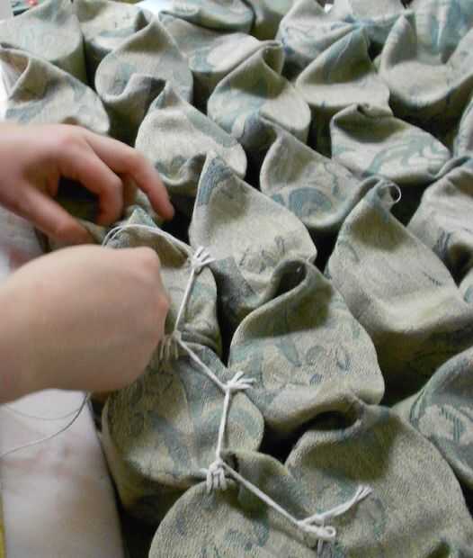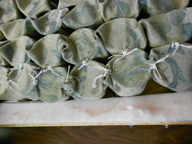 Enhebrar su aguja con hilo y empezar a atar cada uno de los resortes junto con una serie de nudos. Que debe hacer cada lado con un lazo, cuando termines, voltear y hacer el otro lado. A diferencia de los muebles tradicionales donde la madera sí mismo proporciona el apalancamiento para comprimir los resortes, en la formación de un bolsillo la tela y la guita hace este trabajo. Se toma entre 4 a 6 horas a cada lado en un sofá grande déjese tiempo para hacerlo bien. Después de terminar de coser los nudos, cortar aparte.