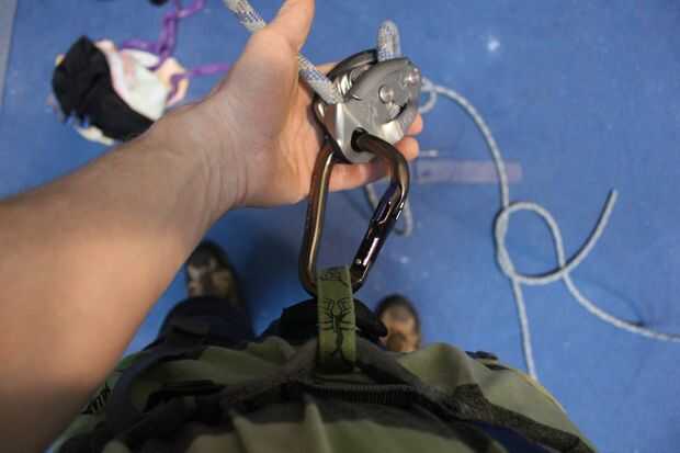 4. Coloque el mosquetón en el Grigri y el mosquetón al arnés del lazo.