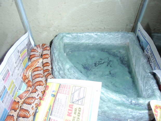 -un plato de agua, lo suficientemente grande para la serpiente en remojo