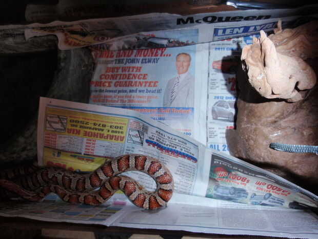Creación de la jaula de la serpiente es fácil. Simplemente colocar algunas hojas de periódico, asegurándose de que se pliegan en los bordes. La almohadilla de calor pasa por debajo de la jaula y se enchufa en un tomacorriente de pared. El tazón de fuente de agua puede ir en la esquina enfrente de la almohadilla de calor. La casa u ocultar va encima de la almohadilla de calor, y el palo y papel higiénico rollo puede ir a cualquier parte. Asegúrese de que no llene el recipiente de agua todo el camino, para que la serpiente de maíz puede bañarse en ella si desea. El termómetro se pega al vidrio, o simplemente puede sentarse en la jaula.