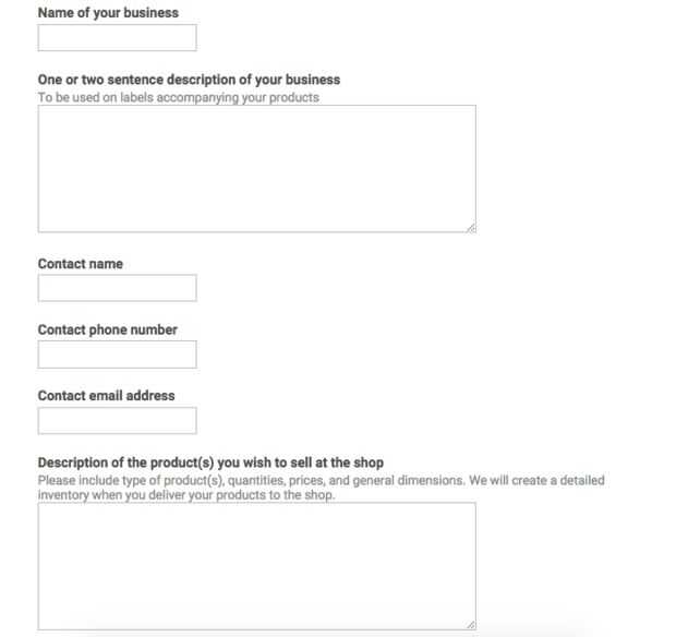 Administrativo, hemos creado un Formulario de Google. Si nunca has hecho esto antes, es muy fácil (y gratis). En la parte superior, hemos tenido una clara explicación de las fechas y horarios para artículo dejar y recoger; la ubicación de la tienda. y una declaración diciendo que no eran responsables por artículos perdidos, robados o dañados. Luego nos piden nombre de empresa, información de contacto, dirección y descripción detallada de lo que querían vender. Respuestas a este formulario fueron expulsados a una hoja de Google, que nos permitió ordenar fácilmente a través de los datos. Más tarde, cuando realmente incorporaciones de inventario en el sistema de pago, ya teníamos una lista de inventario para conciliar con.