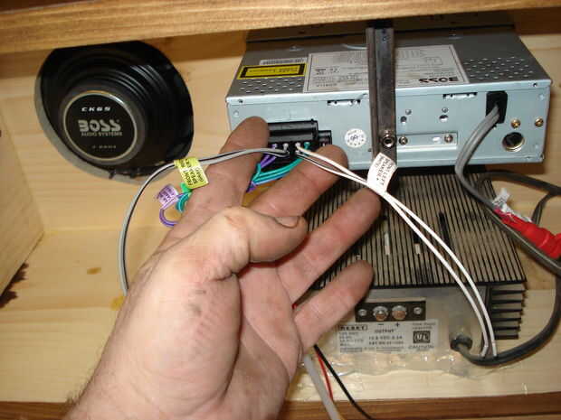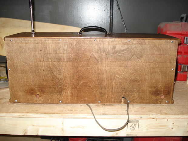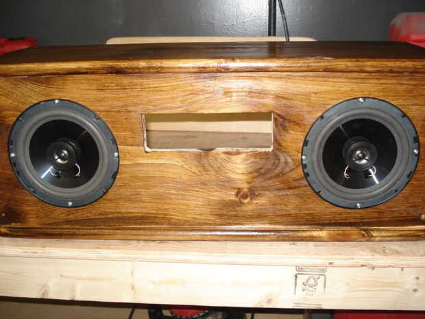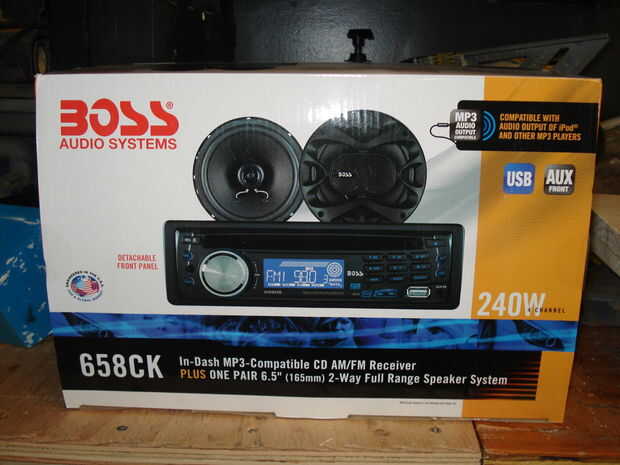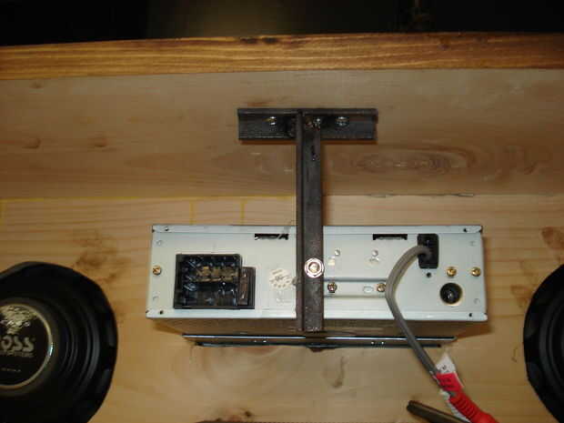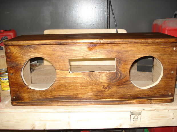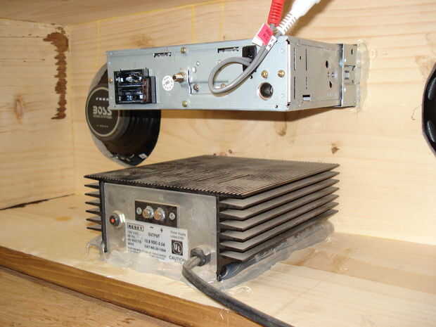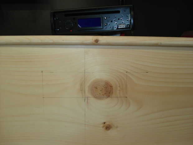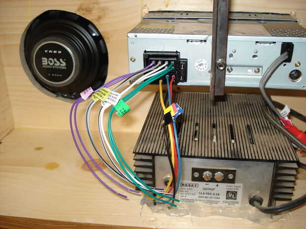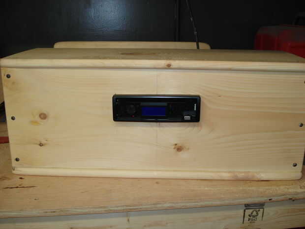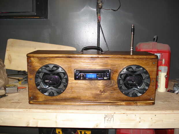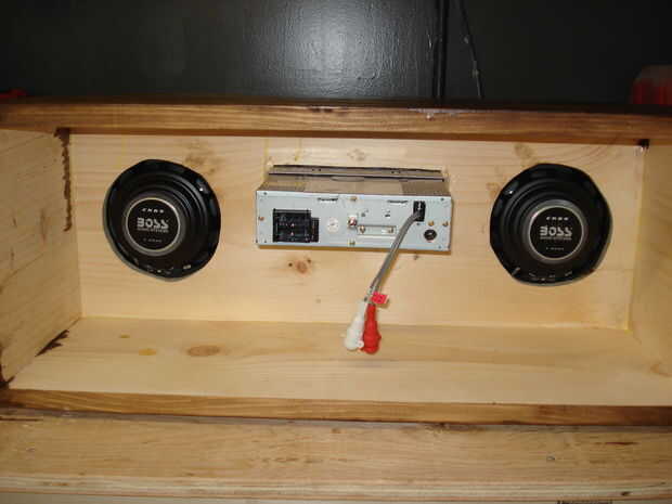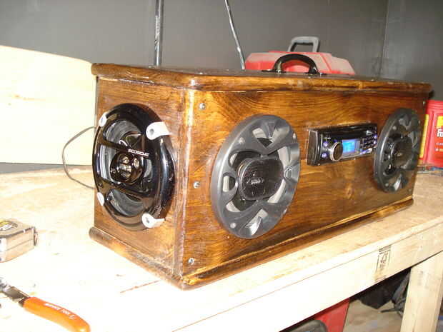 Así que decidí hacer uso del convertidor 12 voltios ya que ya lo tenía. Todo lo que necesitaba era un pedazo de madera y una actualizado autorradio y altavoces, que necesitábamos una nueva radio para nuestro patio de todos modos porque el que tenemos no funciona muy bien. Esto es lo que se me ocurrió.