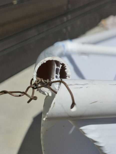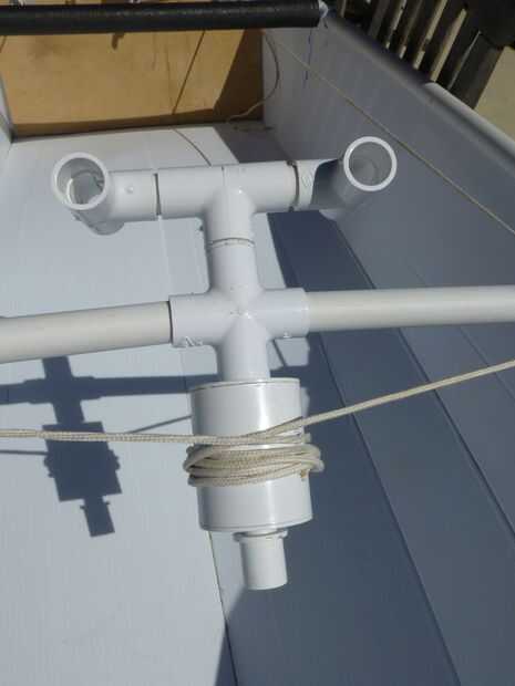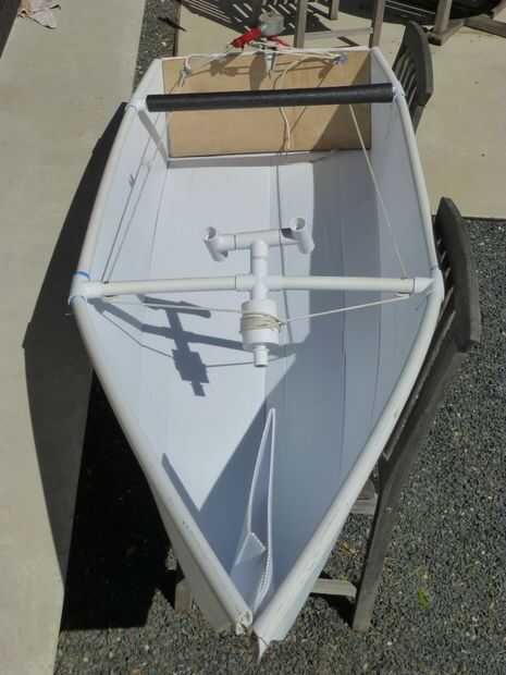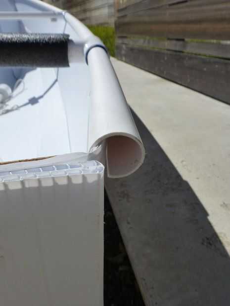 Nuestro amigo carpintero marca utiliza una sierra de mesa para cortar largas hendiduras por cada pieza de PVC. Pongo las piezas de PVC en los bordes exteriores del barco para hacer el borda. Usé conectores de PVC "T" para hacer la frustra que sujetan el barco. Luego, perforar los agujeros en los extremos del arco y utiliza un trozo de alambre de cobre para mantener el arco juntos.