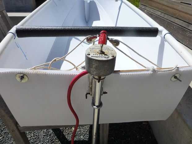 Antes de que el motor, he probado con una pala para asegurarse de que no escape, luego me hizo un volante de PVC y había conectado al conector frontal de T frustrar. Ponemos el trolling motor en la espalda y atado a la rueda delantera del manejo con cuerda y poleas. Por último, atamos el motor a la batería y me fui para una prueba de funcionamiento en nuestra piscina. Incluso llevó a la señora Bird Lake y probé por ahí.