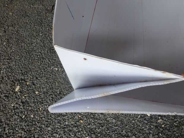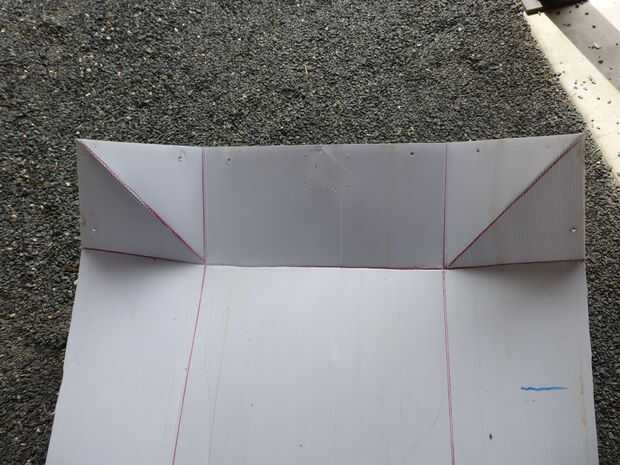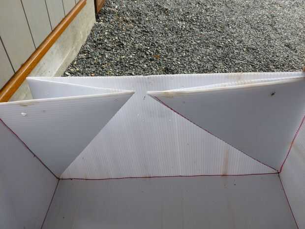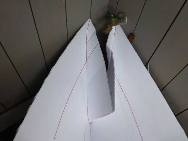 En primer lugar, observamos el videos muchas veces para averiguar lo que sería los pliegues. Incluso hice un bote de modelo de una hoja de papel fuerte para ver lo que sería como. Luego consiguió una hoja de 4'x 8' coroplast y había marcado donde se doblar y cortar. Cortamos un borde inclinado a ambos lados de los bordes laterales para que la popa sería inferior a la proa. A continuación, mi hermano y yo utilizar un secador de pelo para calentar el coroplast así podríamos doblar los pliegues con una herramienta de plegado. Dobla el barco como se dobla origami y mi papá me ayudó a Fije la madera contrachapada en la parte trasera.