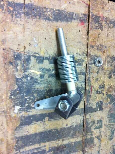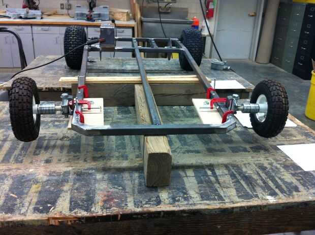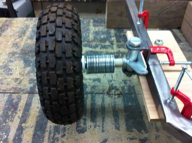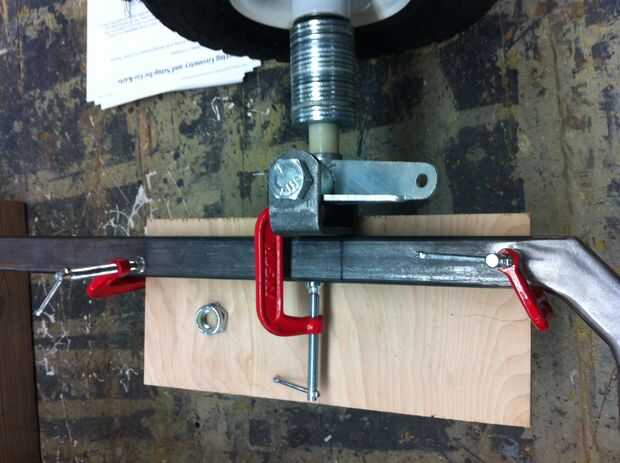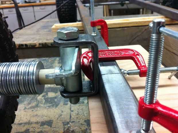 Siguiente paso es colocar los soportes delantero C que contiene los ejes. Incline un poco atrás si los neumáticos delanteros son más pequeños que el trasero. Una vez que tienes montado, entonces puso en el eje con el pivote central. Luego poner espaciadores, arandelas y neumáticos delanteros. (Reemplacé todas las arandelas con tubo de PVC e izquierda una arandela a cada lado de la rueda).