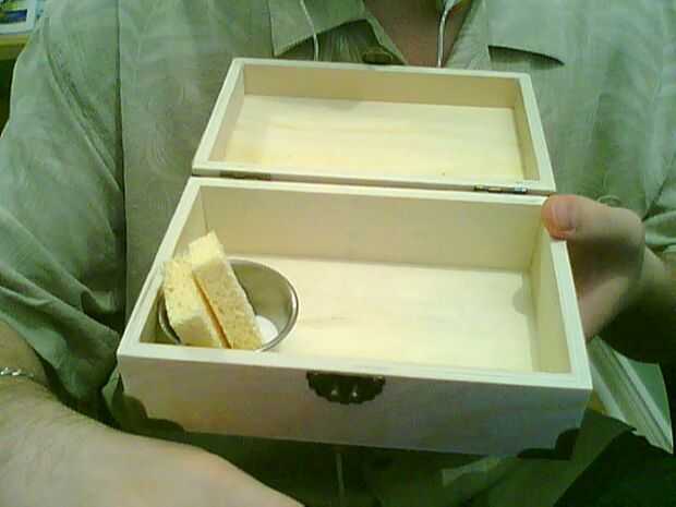 6. Coloque el recipiente de acero con su contenido en la caja de madera