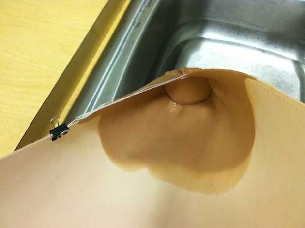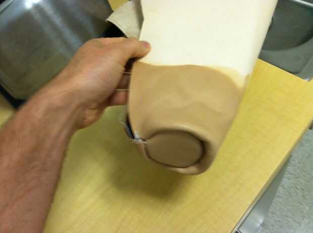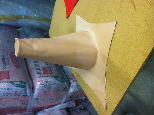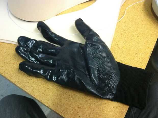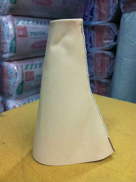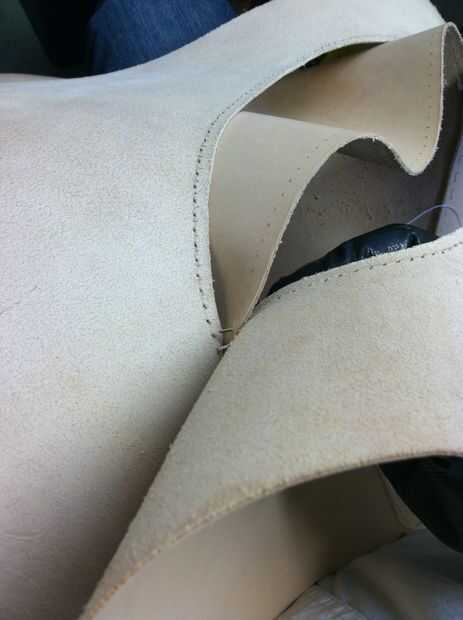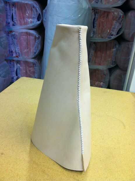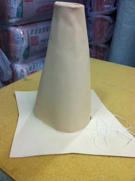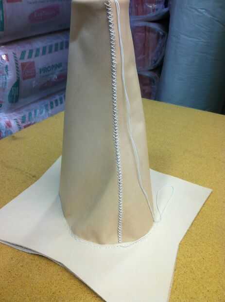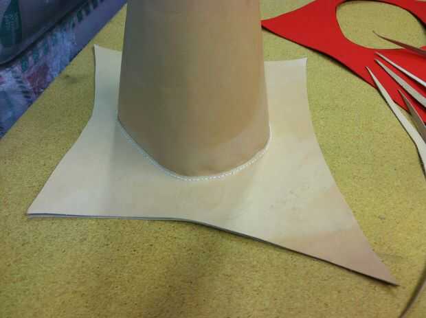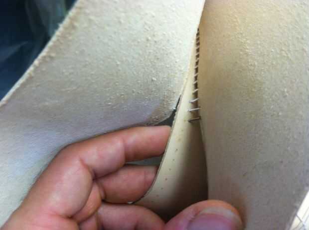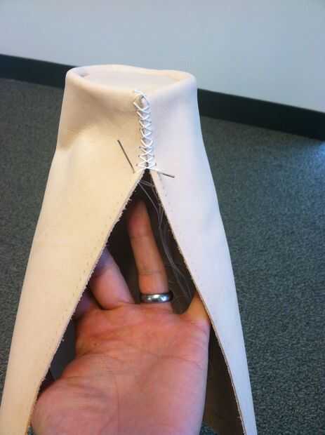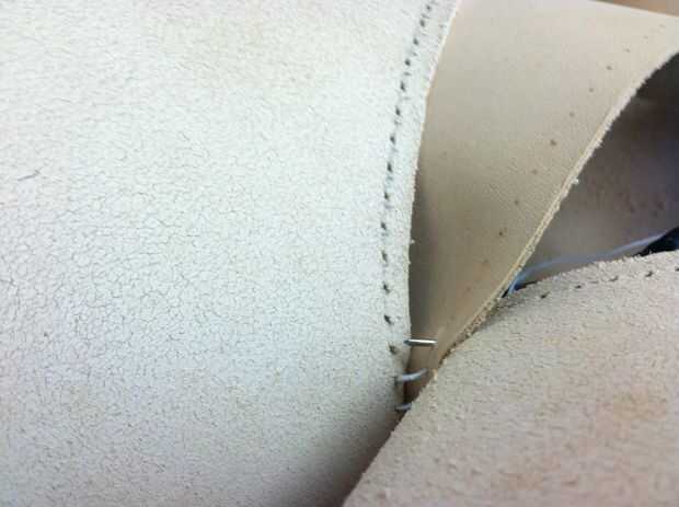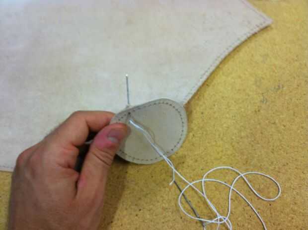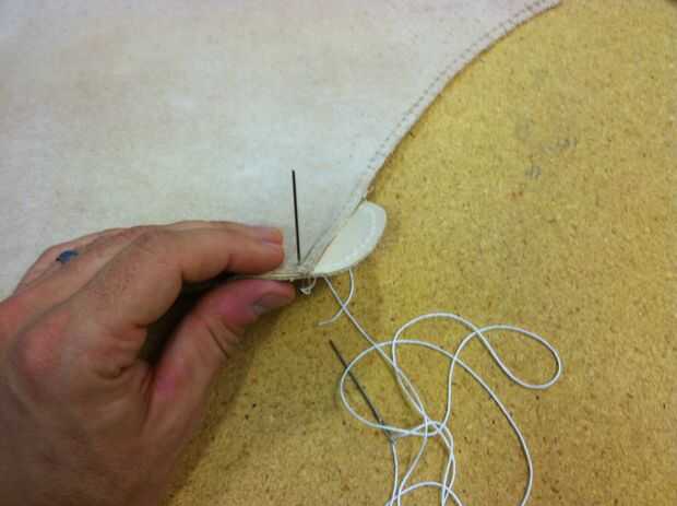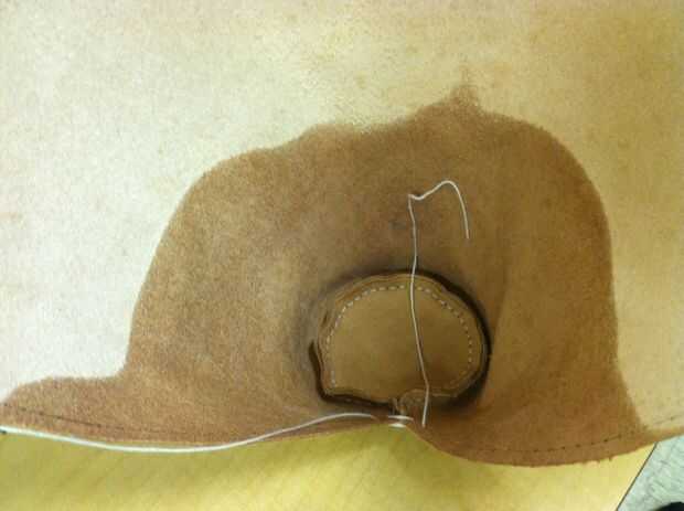 Después de los agujeros de perforación viene la costura les. Normalmente utilizaría un hilo encerado pero supe que fue pintado este sombrero y no quería que el hilo para repeler la pintura por cualquier motivo, así que utilicé un hilo grueso de algodón blanco sin encerar. Mientras que cosido me puse un guante de goma sumergido en una mano para ayudar a empujar la aguja a través de los agujeros. Funcionó hacia fuera muy bien y deseo que había hecho para proyectos anteriores.