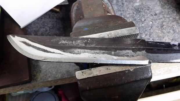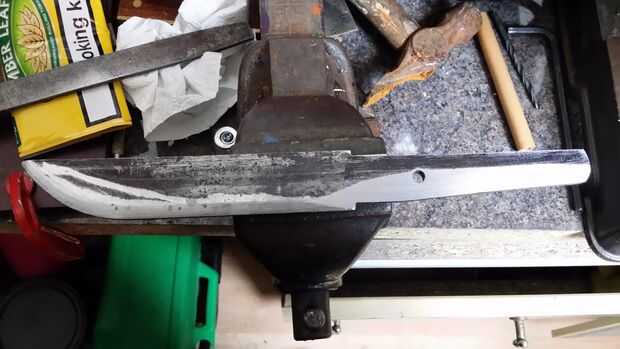 Para líneas de rutina establecieron, fantástico, podemos empezar pulido, usé en esta etapa mi amoladora angular a áspero en los cartabones, pero puede utilizar un archivo, amoladora, lijadora de banda para ello, utilicé mi noble amoladora de ángulo, así que aquí vamos, moler 1/16"(1.5 mm) de cada lado de la espiga, justo hasta el el Ha-Machi (muesca frontal) luego derecho hasta estás líneas de centro en está hoja , quitando poco a poco metal, en un ángulo bajo bonito, no recaliente el disco en cualquier lugar, incluso lisa pasa a ambos lados.