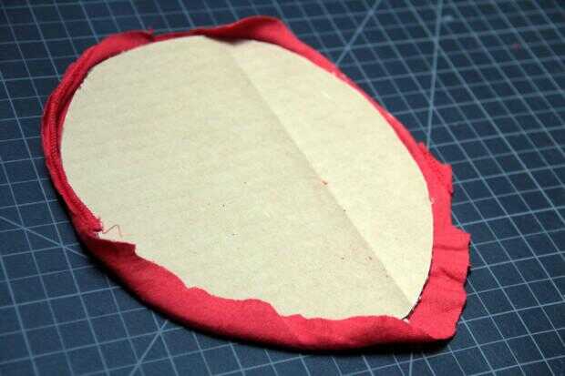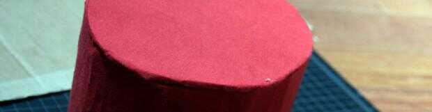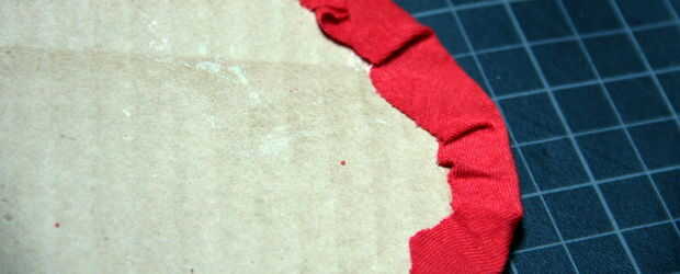 Doblar cuidadosamente en el borde de la costura del sombrero. Tela exceso de palillo en el interior del círculo de cartón.