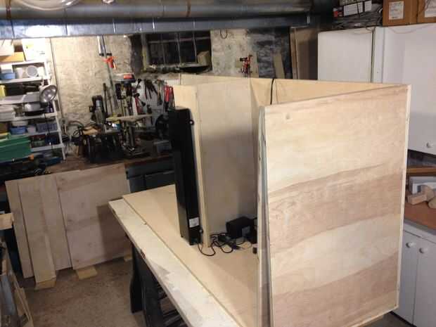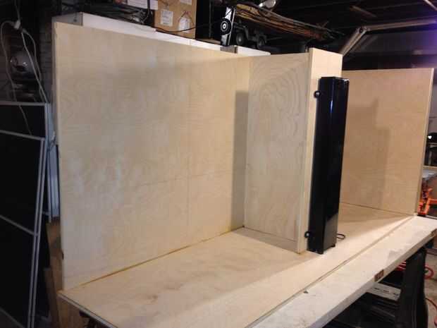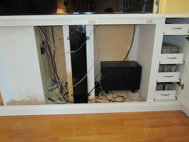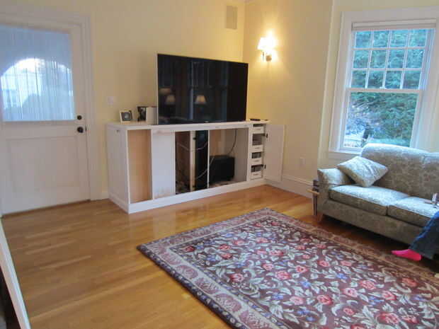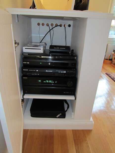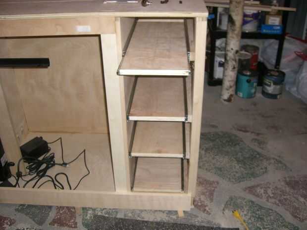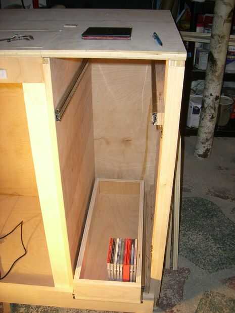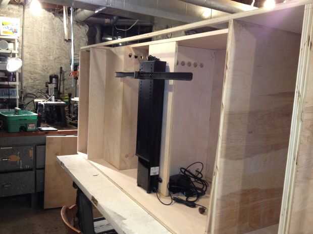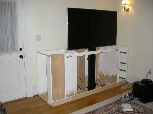 Este Instructable usa contrachapado de abedul y un ascensor por la automatización de Firgelli para implementar el diseño. La televisión se muestra a continuación es un Samsung de 60" pero podría ser cualquier pantalla plana moderno. Incluye estantes para sus componentes y cajones para almacenar DVDs/CDs y mandos de Wii.