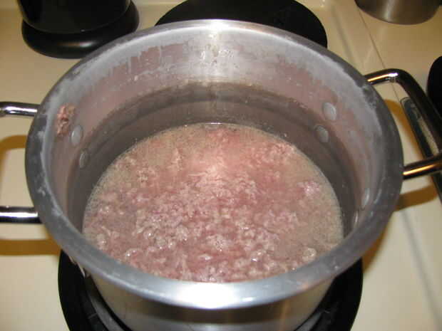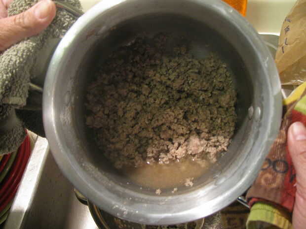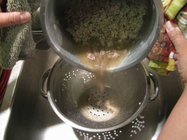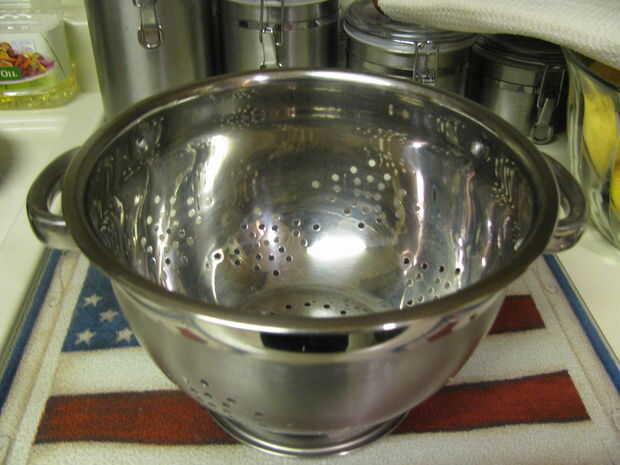 10. 2/3 del agua de la bandeja de drenaje en un colador.