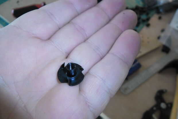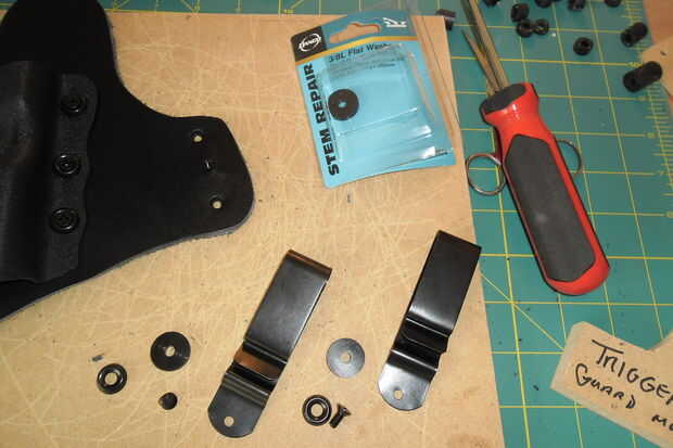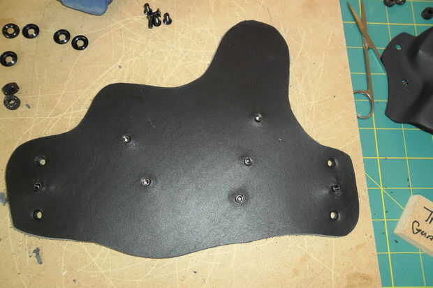 Ahora que todo el hardware es en los puntos, podemos ahora colocar la cáscara de kydex en el cuero, alineando los orificios en la cáscara de kydex con el hardware en el cuero. Utilizar una arandela acaba con los tornillos de montaje ya que tienen una cabeza cónica. Y para las tuercas en T, donde colocar los clips de cinturón, colocar una arandela de goma de 3/8 (de Home depot) sobre los postes. Luego atornille el cips de correa con los mismos tornillos de #8 X 32 X 1/4 como el resto de la funda.